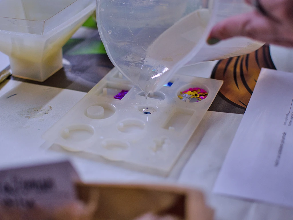 V prozorno epoksidno smolo lahko s pomočjo kalupov vstavimo drobne materiale kot so poldragi kamni, posušene rastline, fotografije na foliji, bleščice in drugi pigmenti. S tem raziskujemo in ustvarjamo unikaten videz vsakega odlitega kosa epoksi obeska.